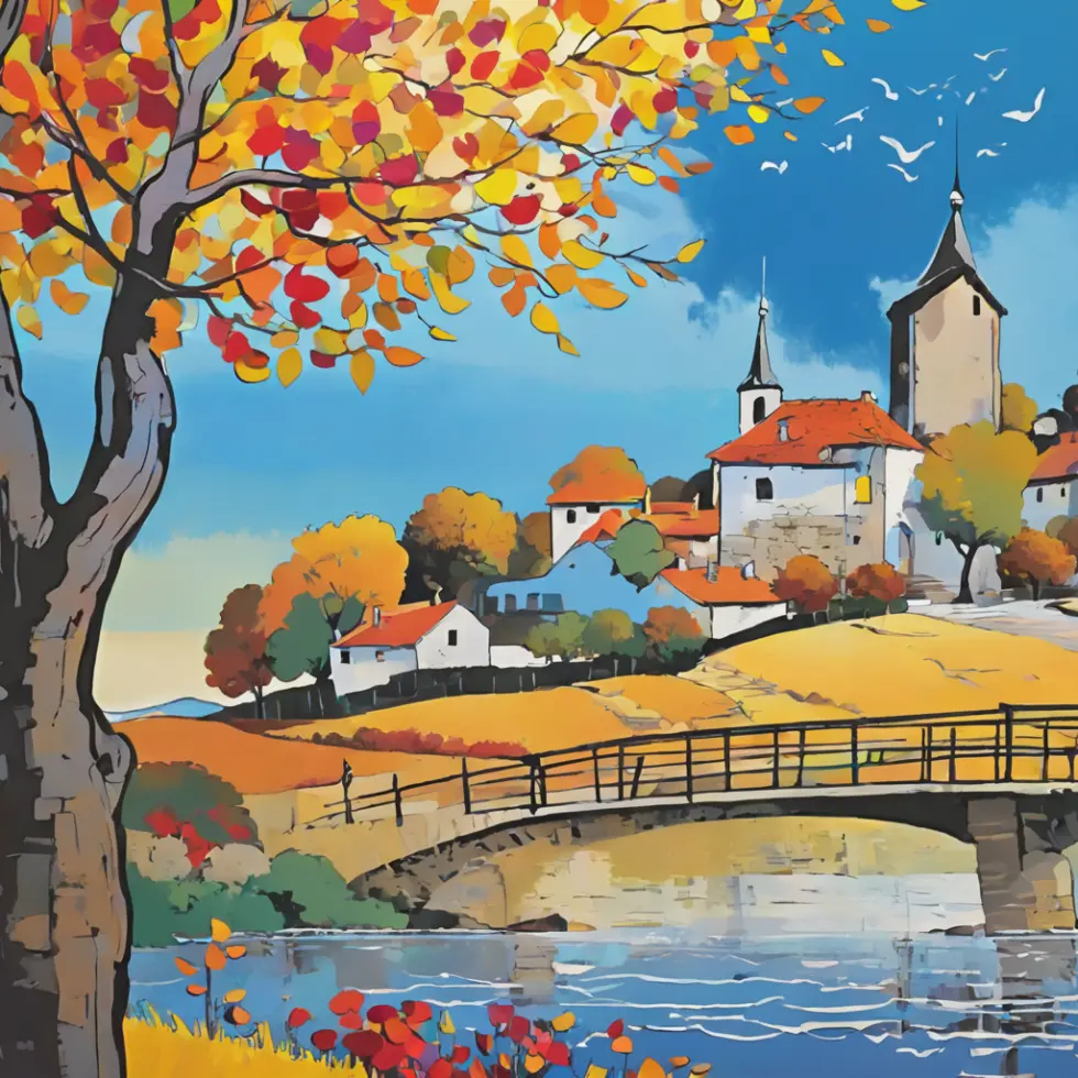 Autumn landscape, village by river, wooden bridge