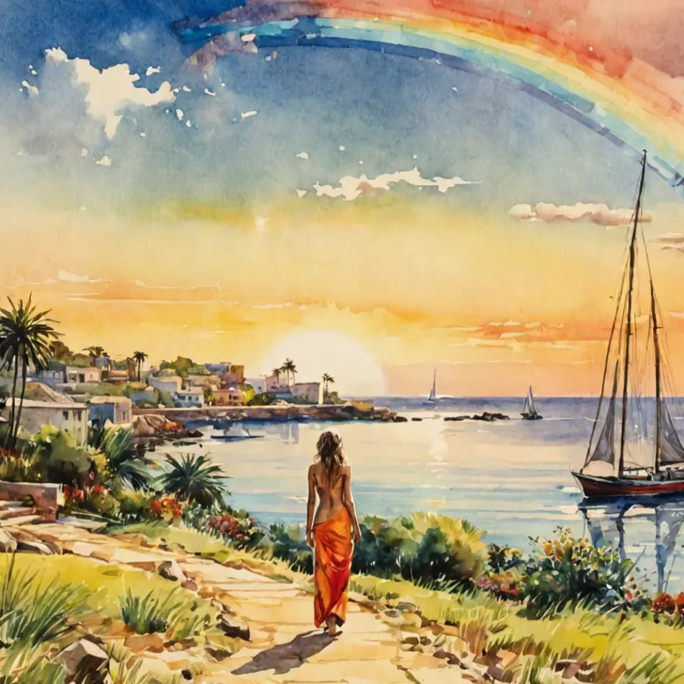 Rainbow and sailboat sunset