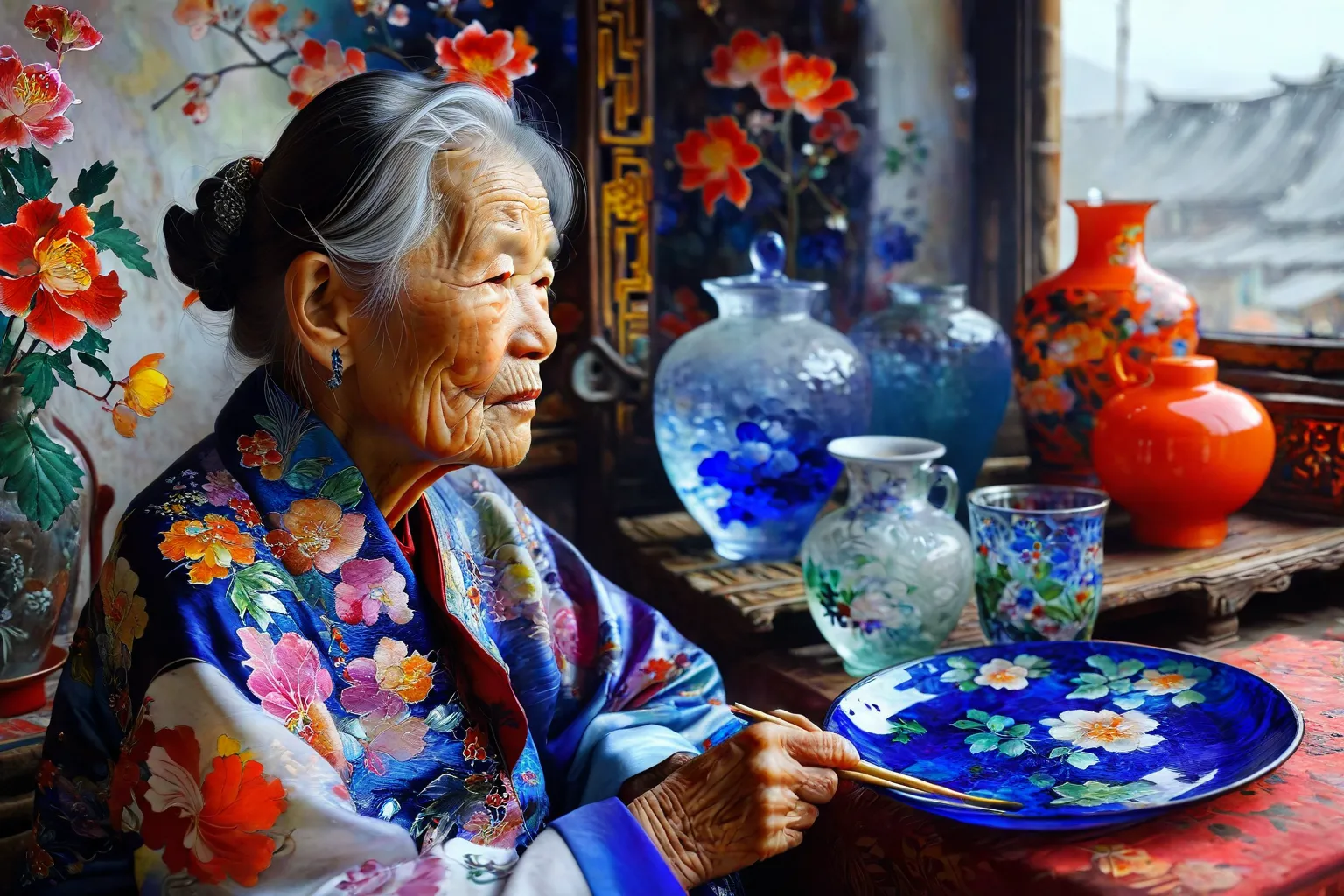 Prompt: old woman, China, day, past, cloudy, Still life, Glass Painting by Mikhail Vrubel