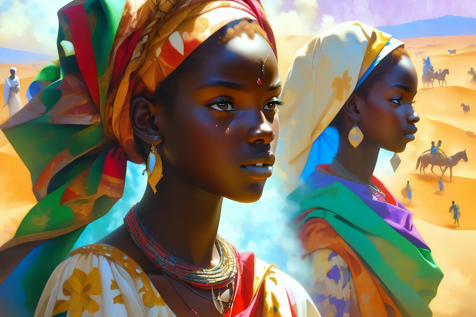Prompt: young women, Burundi, morning, present, sandstorm, Renaissance, Collage Painting by Buonarroti