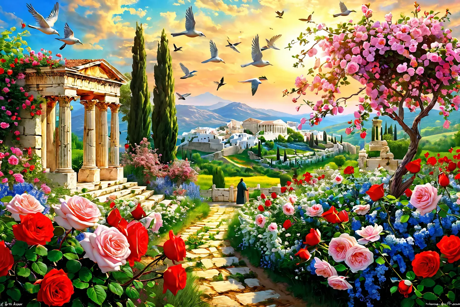Spring, fields, flowers, bloom, birds, songs, life, tender maze, verdant, solace, world, harsh spell, garden, Nature’s spell, enchanted realm, love, longing, one, free, rose, beauty, heart, grace , colorful, very detailed, HD, highly detailed, sharp focus, stunningly beautiful, Classicism Art, inspired by Roman and Greek culture, clarity, harmonious, classicism art
