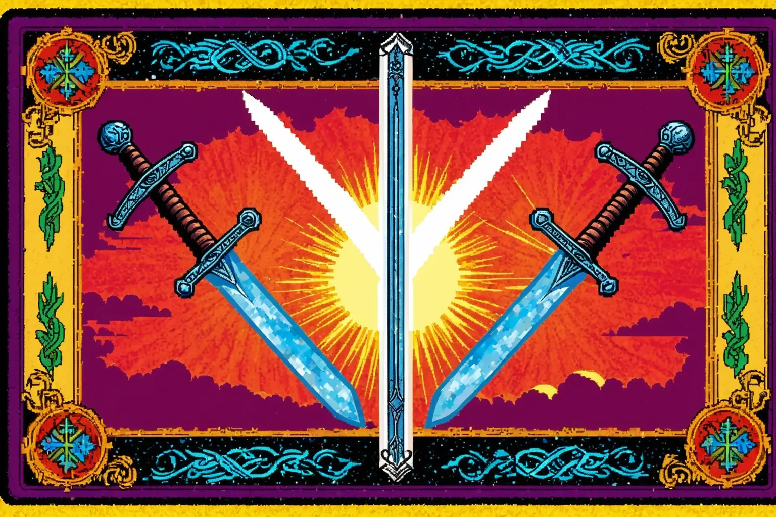 Tarot card, Two of Swords, Internal conflict, hesitation, decision-making, choices, resistance, avoidance, confront challenges, progress, procrastination, fear, self-reflection, motivation, values, crossroads, information, peace, clarity, acknowledgement, indecision, working through feelings, both options, resolution , colorful, very detailed, HD, highly detailed, sharp focus, stunningly beautiful, retro arcade style, 8-bit, pixelated, vibrant, classic video game, old school gaming, reminiscent of 80s and 90s arcade games