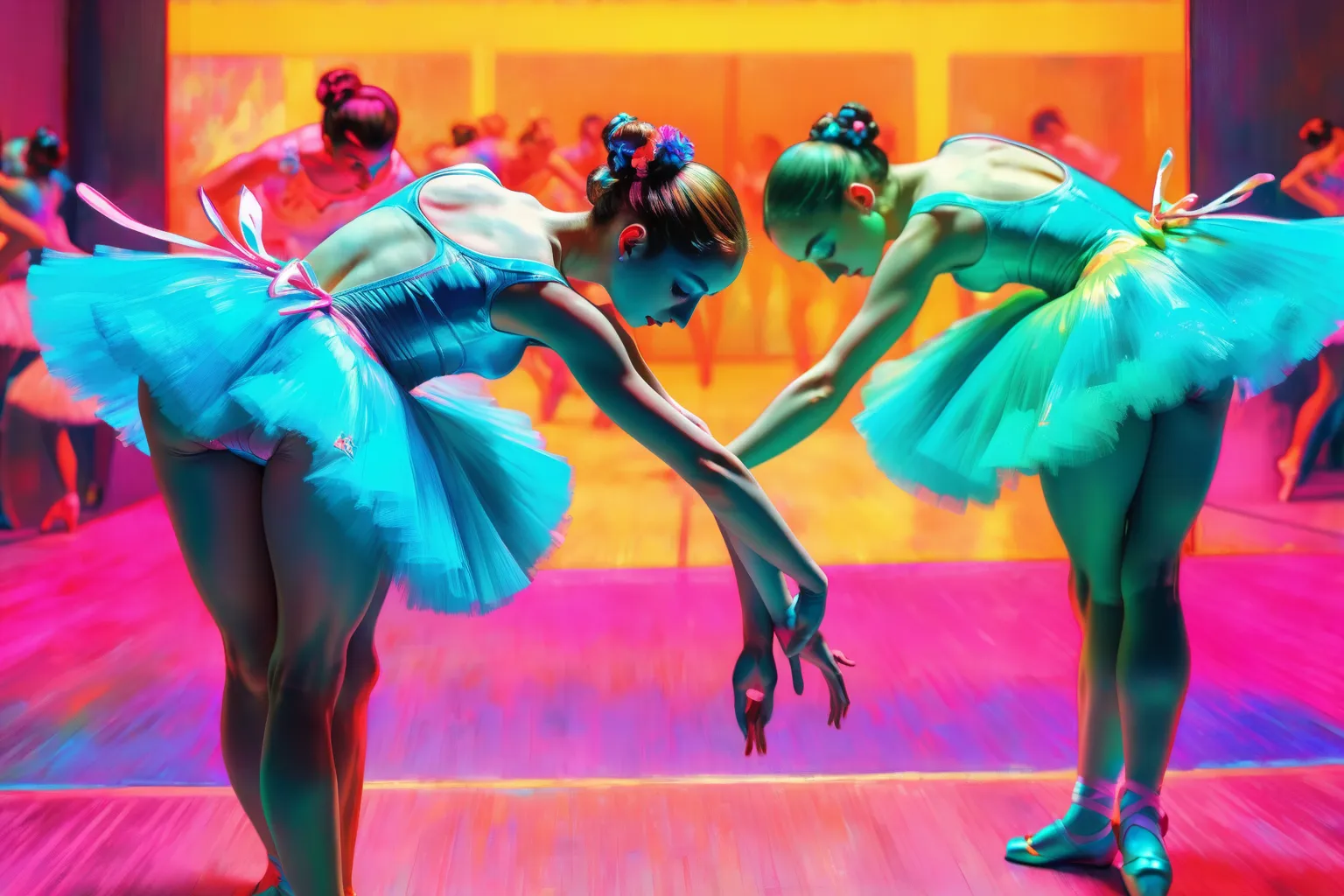 Dancers Bending Down, also known as the Ballerinas by Edgar Degas, colorful, very detailed, HD, highly detailed, sharp focus, stunningly beautiful, vaporwave style, retro aesthetic, cyberpunk, vibrant, neon colors, vintage 80s and 90s style, highly detailed