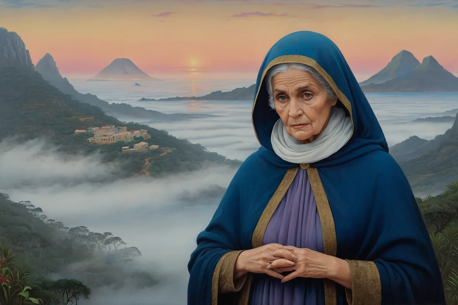Prompt: old woman, Mauritius, dawn, past, fog, Kitsch, Oil Painting by Fra Angelico