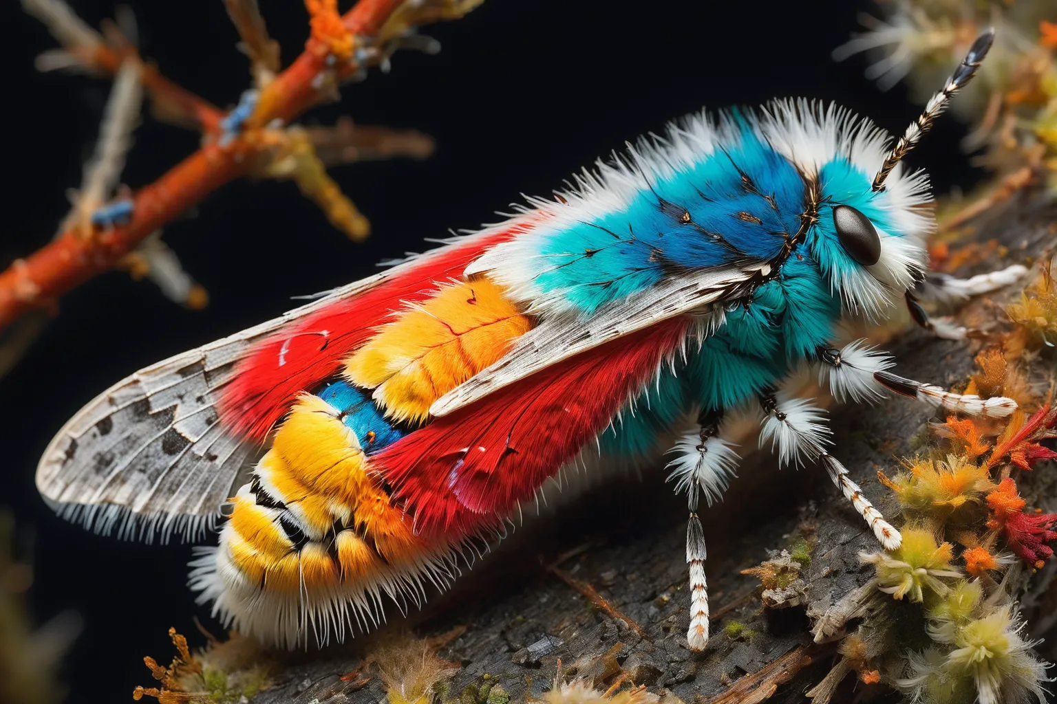 Tussock Moth, colorful, very detailed, HD, highly detailed, sharp focus, stunningly beautiful, Avant-garde, unusual, experimental, avant-garde art