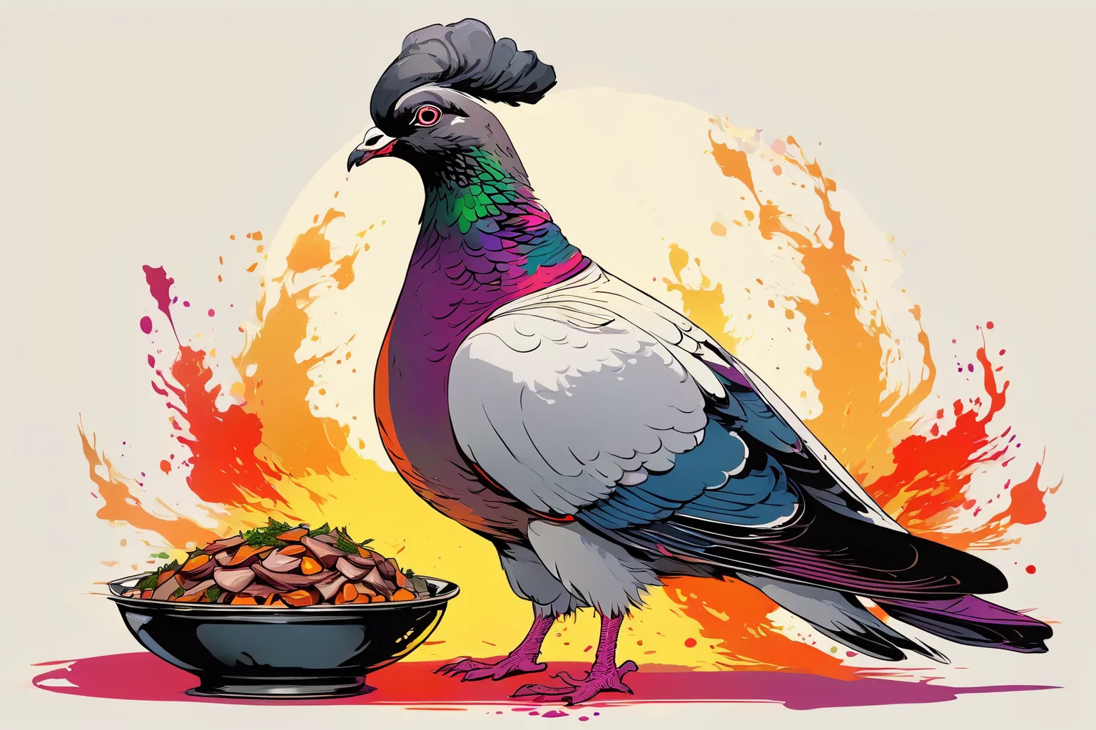 Roasted royal pigeon meal, nude, NSFW, colorful, very detailed, HD, highly detailed, sharp focus, stunningly beautiful, Vector art, Vivid colors, Clean lines, Sharp edges, Minimalist, Precise geometry, Simplistic, Smooth curves, Bold outlines, Crisp shapes, Flat colors, Illustration art piece, High contrast shadows, Technical illustration, Graphic design, Vector graphics, High contrast, Precision artwork, Linear compositions, Scalable artwork, Digital art