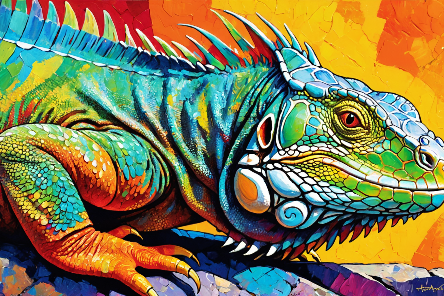 Iguana, NSFW, colorful, very detailed, HD, highly detailed, sharp focus, stunningly beautiful, Fauvism Art, painterly, bold colors, textured brushwork, fauvism art