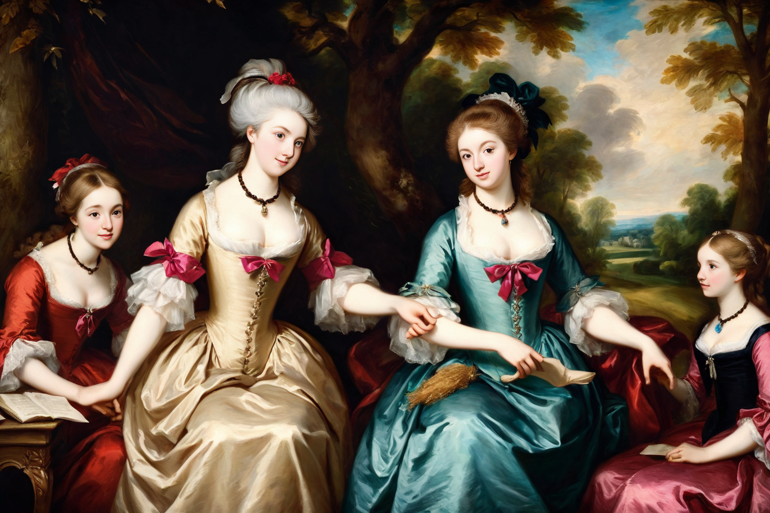 The Ladies Waldegrave by Joshua Reynolds, colorful, very detailed, HD, highly detailed, sharp focus, stunningly beautiful, role-playing game (RPG) style fantasy, detailed, vibrant, immersive, reminiscent of high fantasy RPG games