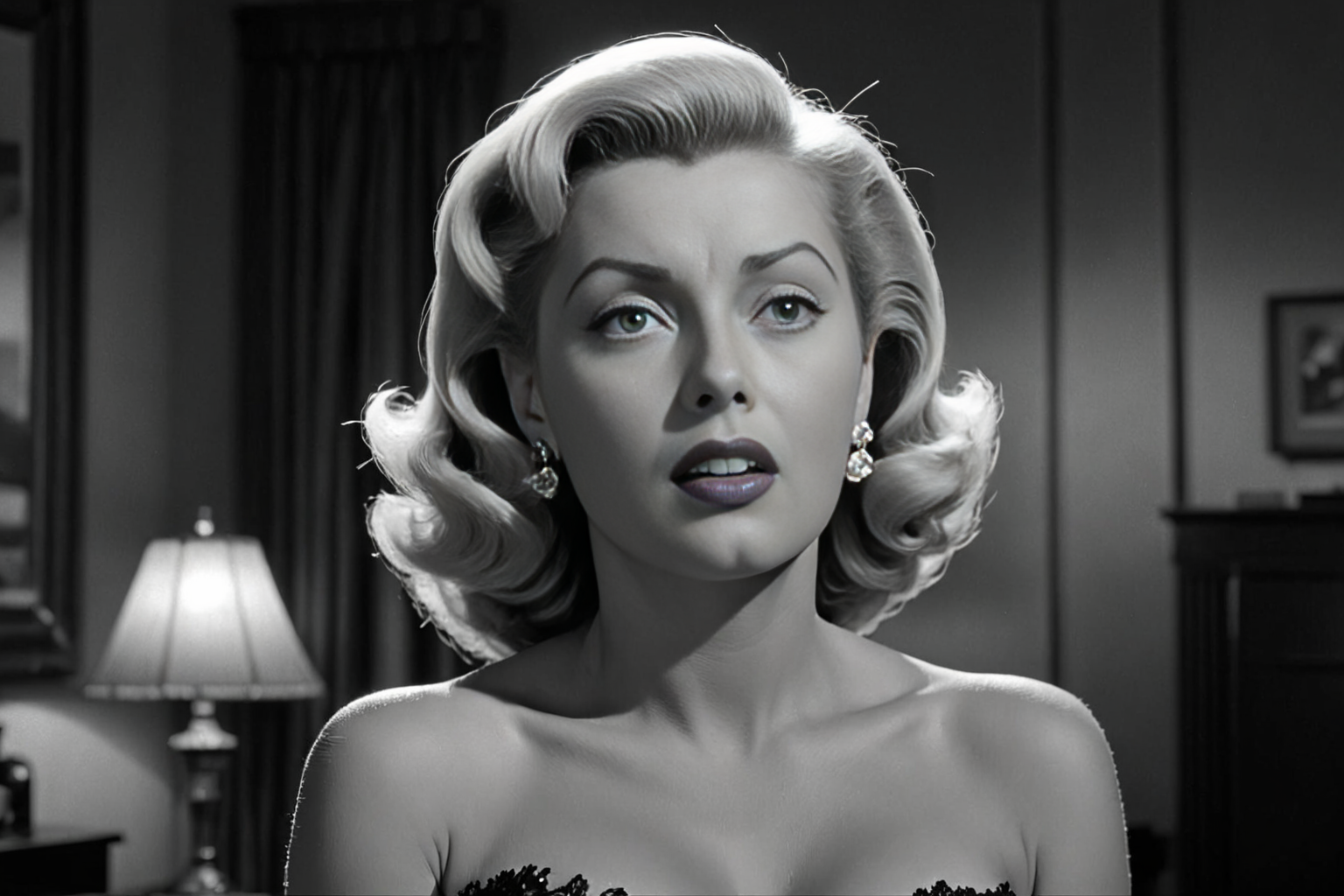 Movie: The Bigamist (1953), film, title, director, Billy Wilder, year, 1953, genre, movie noir, star, Lana Turner, character, nightclub singer, plot, seductive, affair, husband, bigamist, actor, Kirk Douglas , nude, NSFW, colorful, very detailed, HD, highly detailed, sharp focus, stunningly beautiful, (b&w, Monochromatic, Film Photography:1,3), Photorealistic, Hyperrealistic, Hyperdetailed, film noir, analog style, soft lighting, subsurface scattering, realistic, heavy shadow, masterpiece, best quality, ultra realistic, 8k, golden ratio, Intricate, High Detail, film photography, soft focus