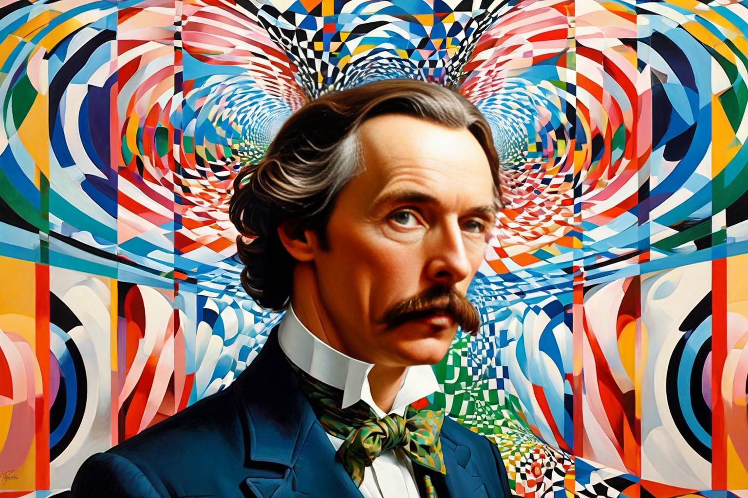 Robert Louis Stevenson, portrait, colorful, very detailed, HD, highly detailed, sharp focus, stunningly beautiful, Op Art, optical illusion, abstract, geometric pattern, impression of movement, Op Art