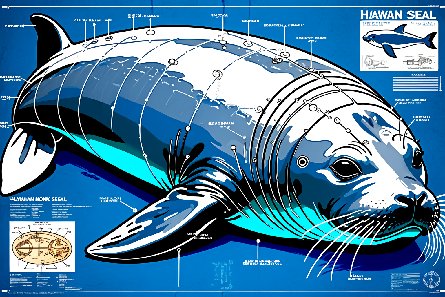 Hawaiian Monk Seal, NSFW, colorful, very detailed, HD, highly detailed, sharp focus, stunningly beautiful, Blueprint Schematic Drawing, technical drawing, blueprint, schematic