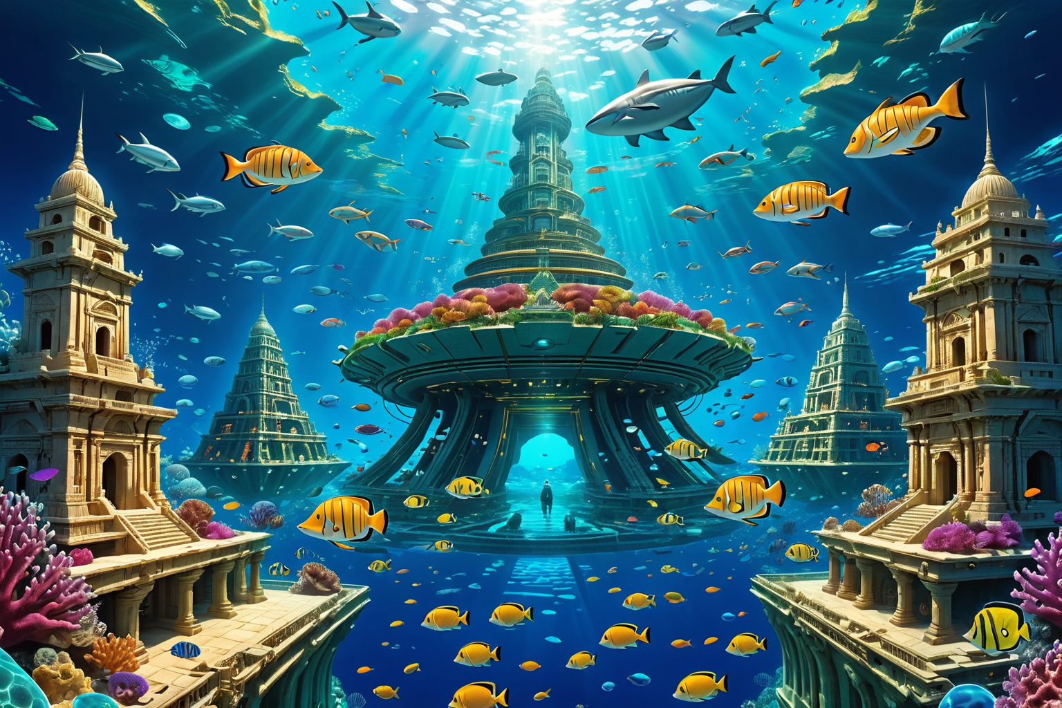 The team stands at the edge of the underwater city, looking out at the vast expanse of water and sea creatures swimming by.