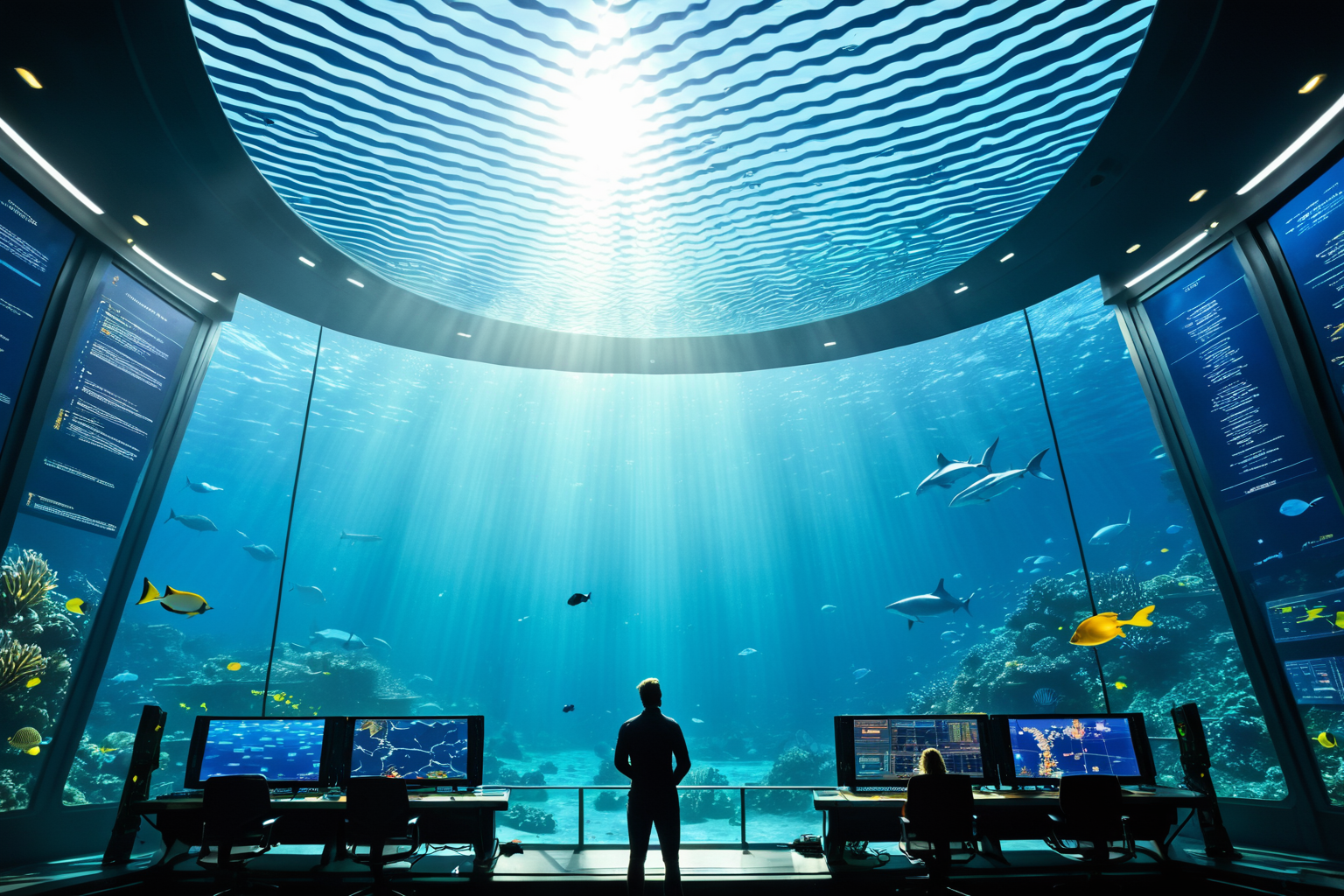 Ripple Effect TV series, underwater city, team, ocean, sea creatures, sunlight, map, dimensions, control room, data, screens, Zephyr, Maya, Elliot, Jesse, caution, consequences, dimensions, stability, energy signature, exploration, understanding, home, teamwork, dimensions, unknown, tension, expanse, sea creatures, swimming, water, rays, ethereal glow , colorful, very detailed, HD, highly detailed, sharp focus, stunningly beautiful, hyper-detailed, HDR+, 16K, Silhouette Art, high contrast, well defined, Silhouette Art