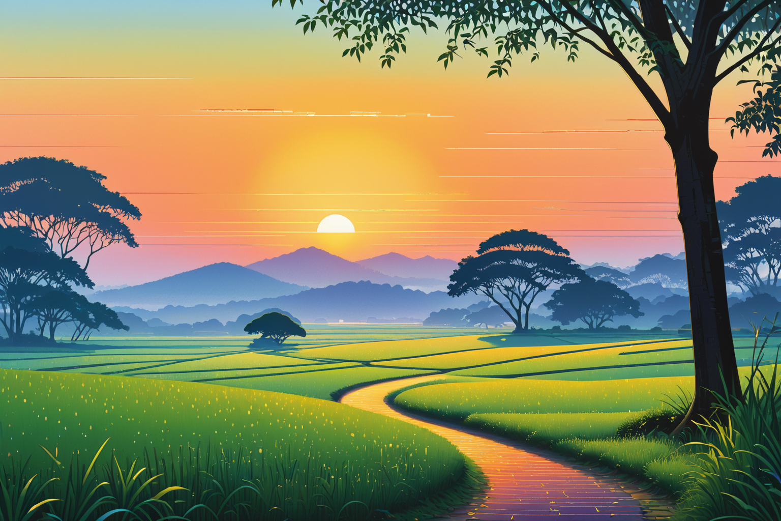 Daphne, Philippines, dawn, long-long ago, dew, Misérabilisme, Mixed media painting by Georges Seurat, colorful, very detailed, HD, highly detailed, sharp focus, stunningly beautiful, hyper-detailed, HDR+, 16K, Vector art, Vivid colors, Clean lines, Sharp edges, Minimalist, Precise geometry, Simplistic, Smooth curves, Bold outlines, Crisp shapes, Flat colors, Illustration art piece, High contrast shadows, Technical illustration, Graphic design, Vector graphics, High contrast, Precision artwork, Linear compositions, Scalable artwork, Digital art