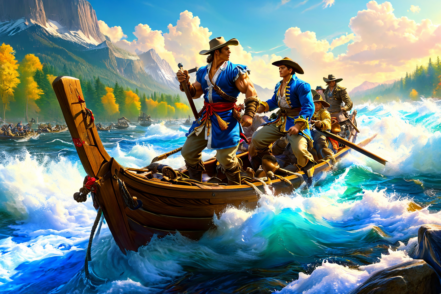 Washington Crossing the Delaware by Emanuel Leutze, colorful, very detailed, HD, highly detailed, sharp focus, stunningly beautiful, hyper-detailed, HDR+, 16K, Street Fighter style, vibrant, dynamic, arcade, 2D fighting game, highly detailed, reminiscent of Street Fighter series