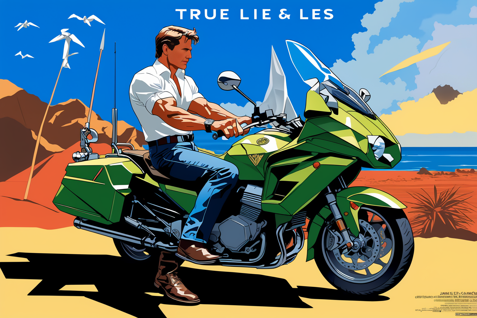 Movie: True Lies (1994), True lies (1994) movie title, Harrison ford, James cameron, action comedy, Jamie lee curtis, Tom Arnold , colorful, very detailed, HD, highly detailed, sharp focus, stunningly beautiful, hyper-detailed, HDR+, 16K, origami style, paper art, pleated paper, folded, origami art, pleats, cut and fold, centered composition