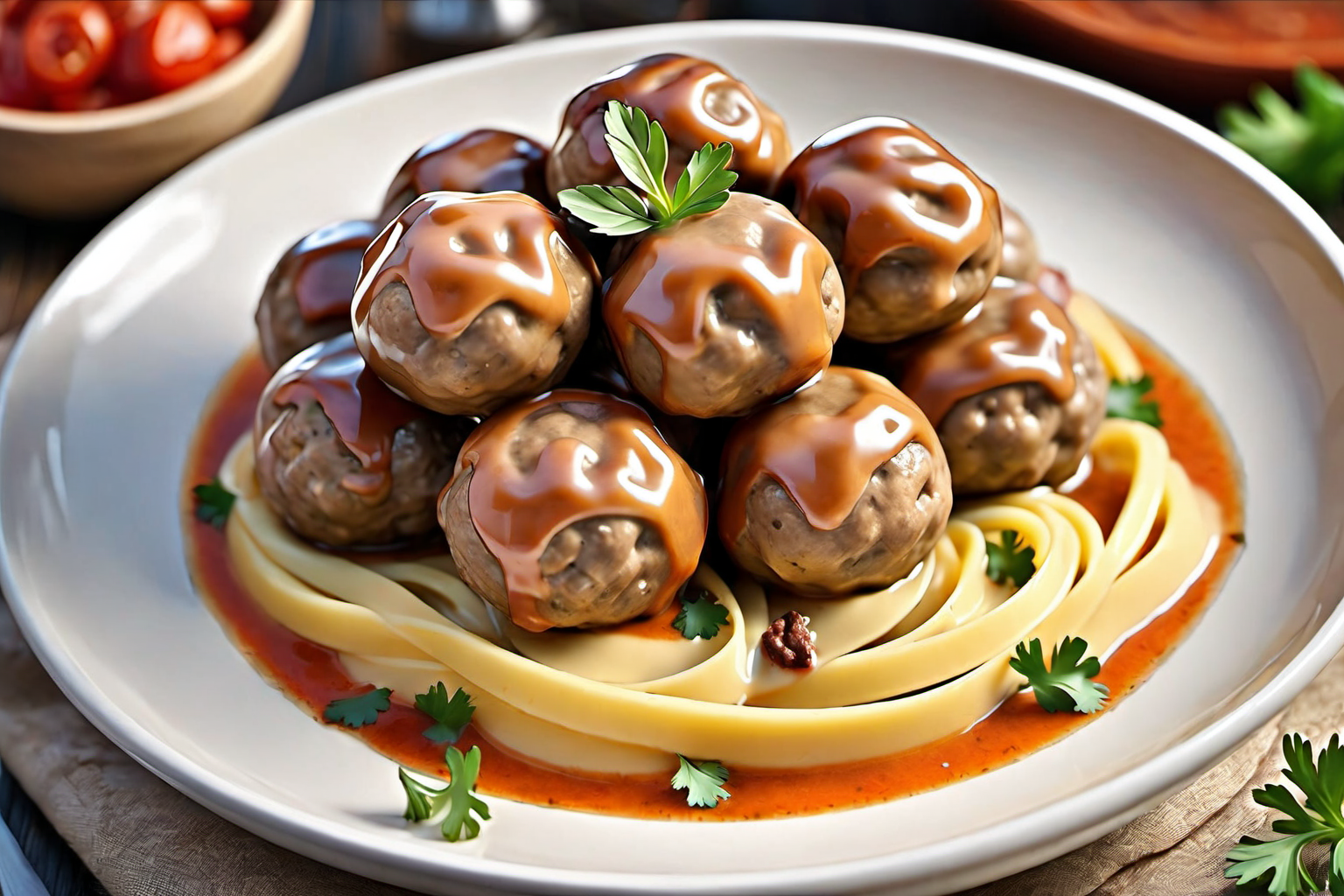 Garnish the Swedish meatballs with chopped fresh parsley before serving with mashed potatoes or egg noodles. Enjoy your delicious homemade meal!