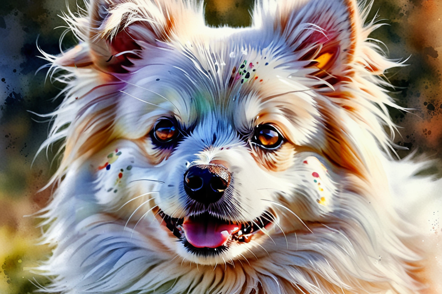 Aussiepom, colorful, HD, sharp focus, stunningly beautiful, hyper-detailed, HDR+, 64K, Watercolor style painting, visible paper texture, colorwash, watercolor