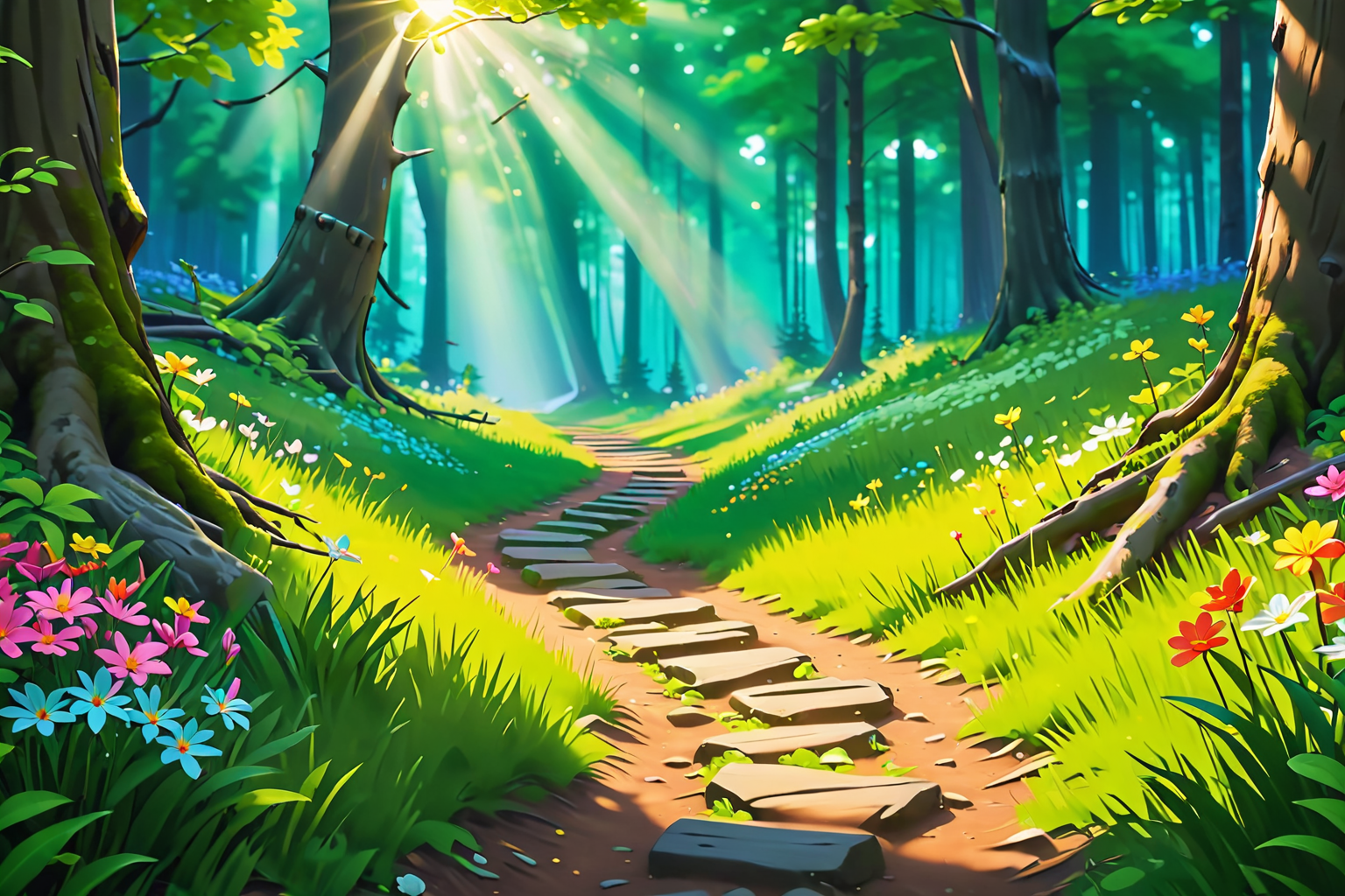 spring forest tranquil, green and sweet breathing, flowers under feet shine, brooks along paths play, love in heart hidden, like first sunbeams. Inspiration quietly thrives, like first spring flower. , NSFW, colorful, HD, sharp focus, stunningly beautiful, hyper-detailed, HDR+, 64K, Fortnite Art Style, 3D cartoon, colorful, Fortnite Art Style