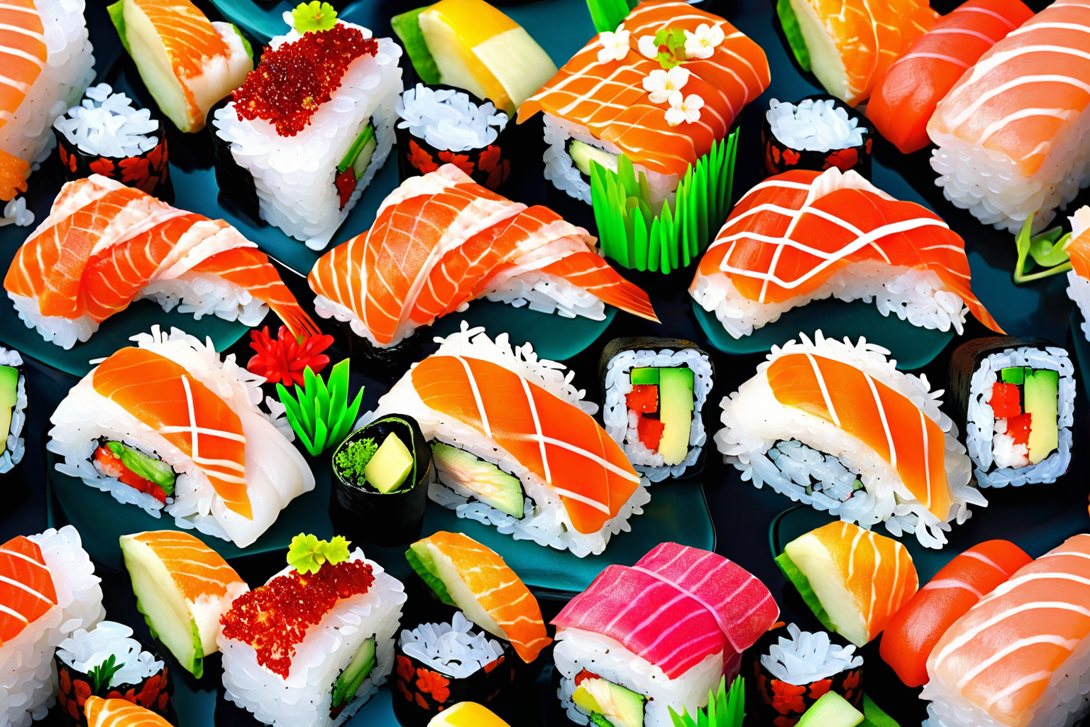 Sushi dish, colorful, HD, sharp focus, stunningly beautiful, hyper-detailed, HDR+, 64K, isometric style, vibrant, beautiful, crisp, detailed, ultra detailed, intricate