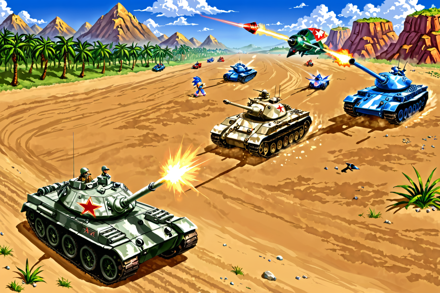 Game: Command & Conquer: Red Alert 2 (2000), Alternate history, Hitler, Stalin, Soviet Union, Europe, campaign, multiplayer, military units, tactics, Allies, Soviets, weapons, Prism tanks, Sonic Dolphins, real-time strategy gameplay, scenarios, over-the-top units , nude, NSFW, colorful, HD, sharp focus, stunningly beautiful, hyper-detailed, HDR+, 64K, Street Fighter style, vibrant, dynamic, arcade, 2D fighting game, highly detailed, reminiscent of Street Fighter series