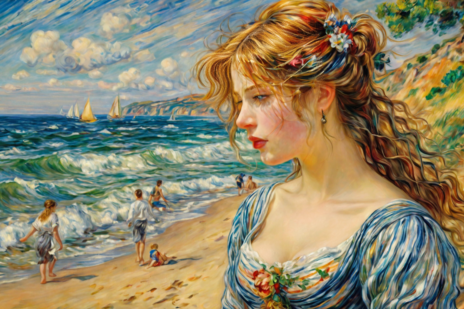 By the Seashore by Pierre-Auguste Renoir, colorful, HD, sharp focus, stunningly beautiful, hyper-detailed, HDR+, 64K, Neo-Futurism, high-tech, curves, spirals, flowing lines, idealistic future, Neo-Futurism
