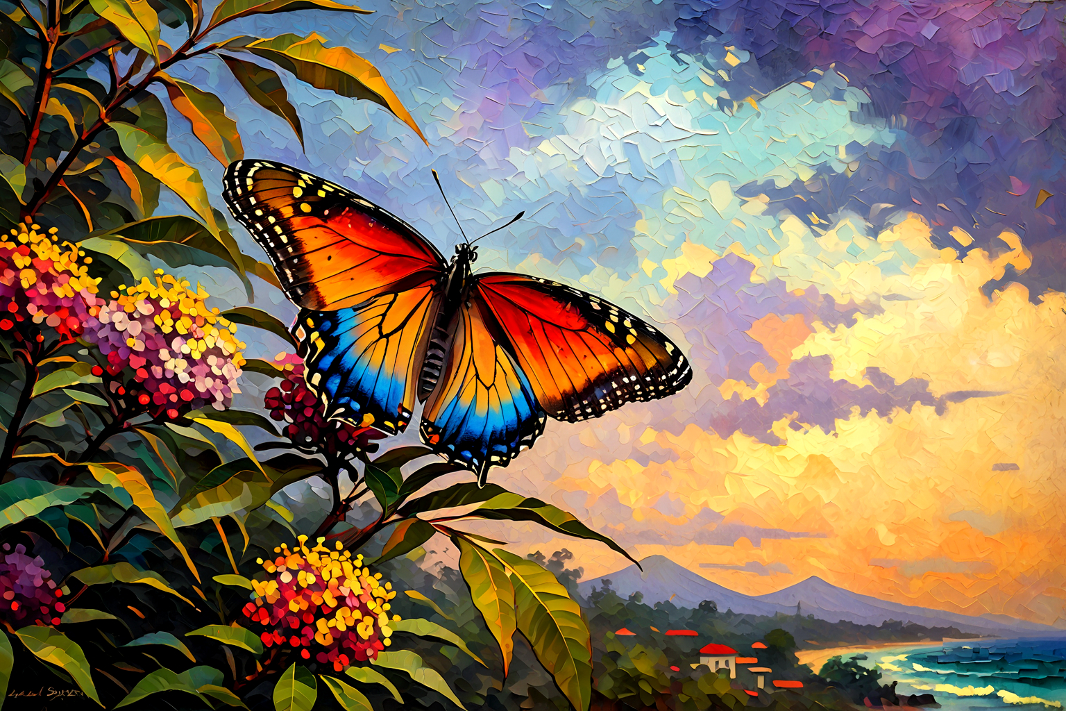 Prompt: Butterfly Bush, Costa Rica, evening, not long ago, cyclone, Post-impressionism, Board Painting by Georges Seurat