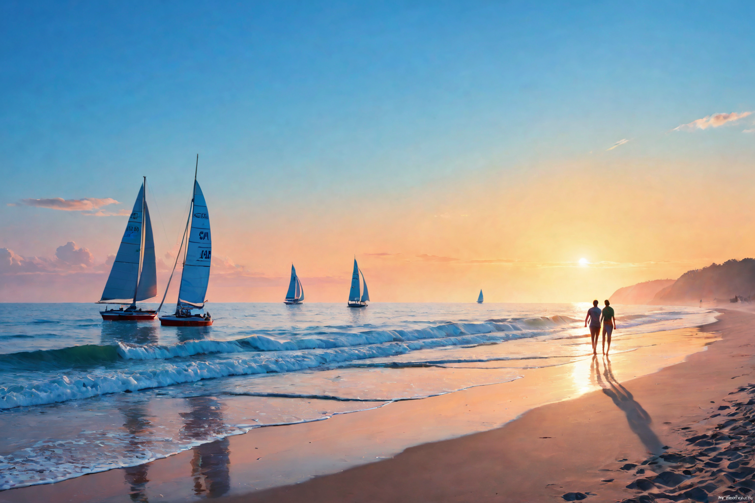 The picture takes place in Poland at morning in the future. The weather is sunshine. The scene features a serene coastal landscape with gentle waves lapping at the shore. In the distance, you can see sailboats on the horizon. The genre is Marine in Board Painting technique by artist Frédéric Bazille. Two figures in traditional Polish attire are walking along the beach, holding hands and enjoying the sunrise. The sky is painted with vibrant hues of orange and pink, blending seamlessly into a clear blue above. Soft fog hangs over the water, adding depth to the scene.