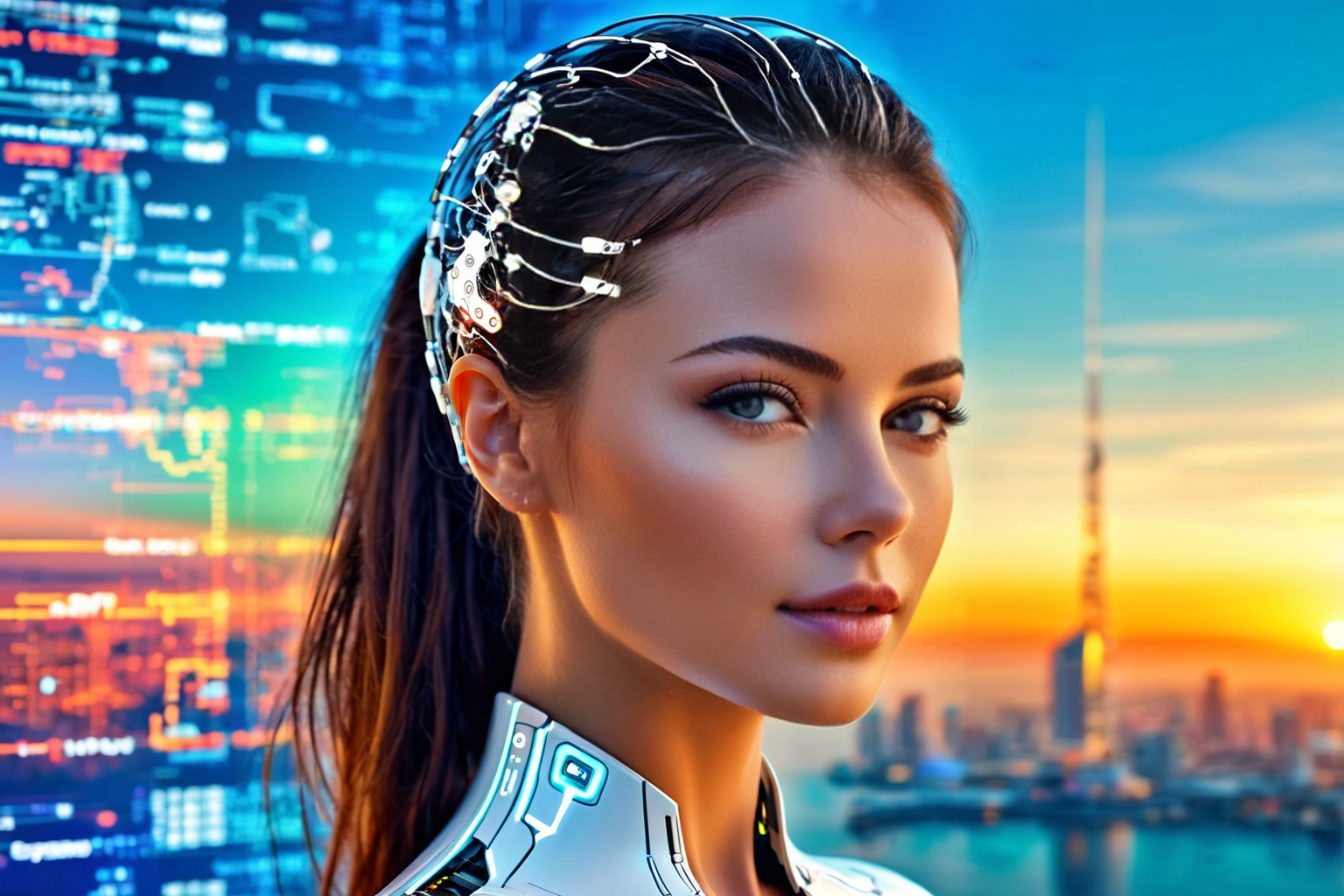 beautiful woman, in full height, great body, gorgeous figure, beautiful face, learns Hamilton C shell programming language, beautiful background, magnificent scenery, HD, sharp focus, stunningly beautiful, hyper-detailed, HDR+, cybernetic style, futuristic, technological, cybernetic enhancements, robotics, artificial intelligence themes