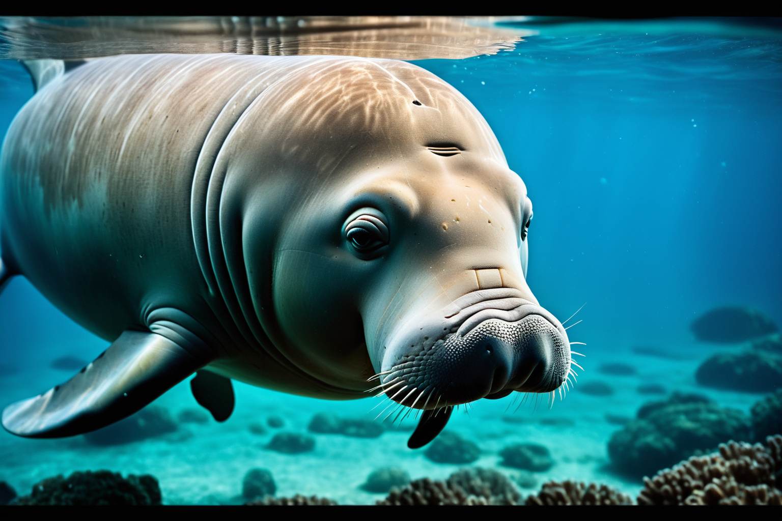 Dugong, 2000s vintage RAW photo, photorealistic, film grain, candid camera, color graded cinematic, eye catchlights, atmospheric lighting, macro shot, skin pores, imperfections, natural, shallow dof, HD, sharp focus, stunningly beautiful, hyper-detailed, HDR+, Tranquil Relaxing Atmosphere, calming style, soothing colors, peaceful, idealic, Tranquil Relaxing Atmosphere