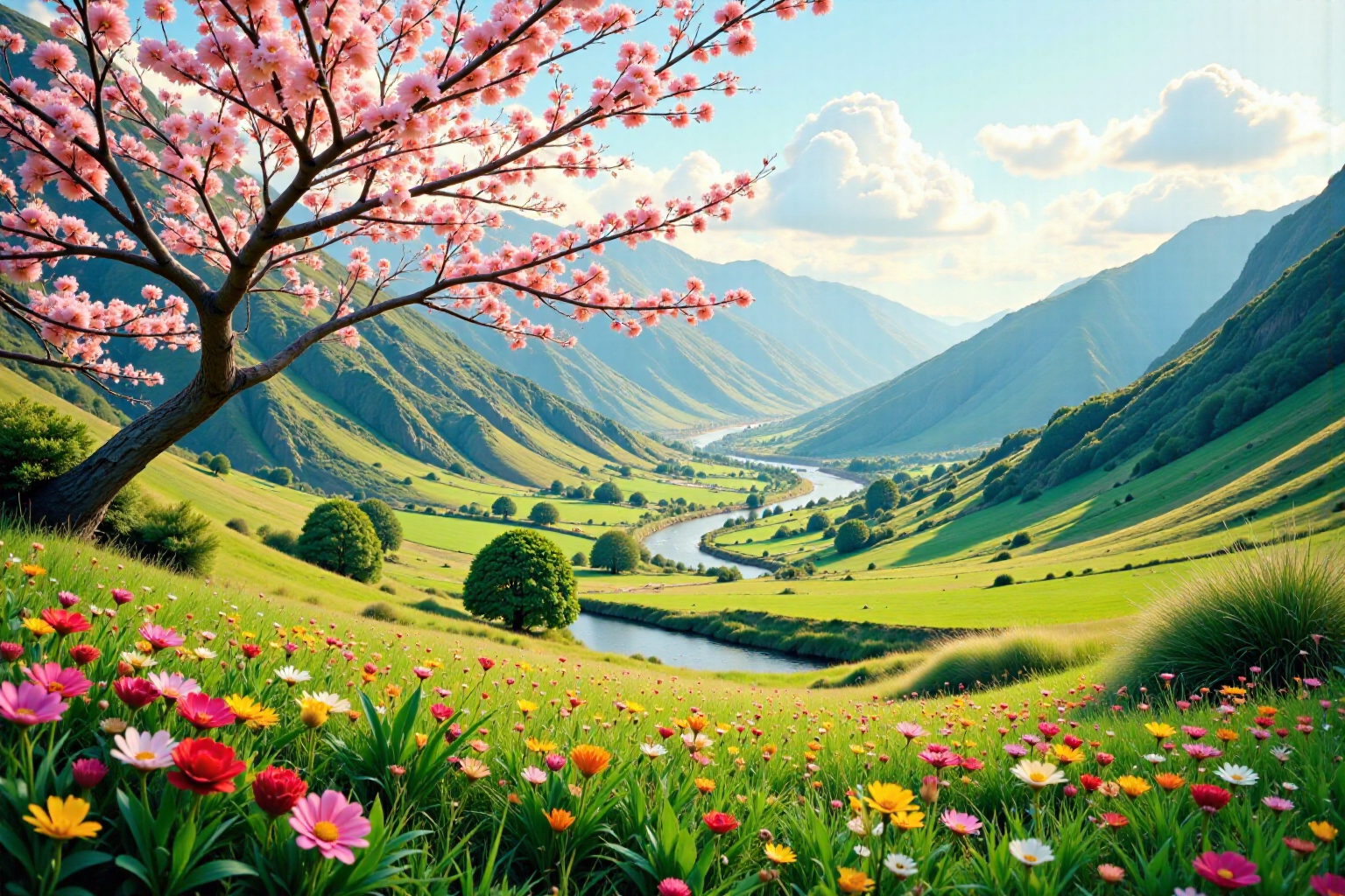 Aidan Salakhova style, , spring, wind, light, branches, leaves, soft, life, river, water, flow, endless, mountain, flowers, bloom, image, sunshine, body, heart, rhythm, natural, nature, poetry, hope, fire, warm, soul, field, green, grass, cultivator, song, echo, sky, cloud, sea, blue, river, water, flow, endless, mountain, flower, tree, grass, meadow, hillside, farm, farmer, singing, melody, soil, planting, tradition, culture, continuation, life, vitality, China, spirit, generation, afterlife HD, sharp focus, stunningly beautiful, hyper-detailed, HDR+, Japanese Ink Drawing, ink drawing, inkwash, Japanese Ink Drawing