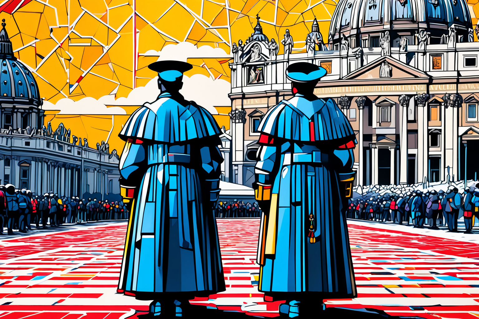 Piet Mondrian style, , Vatican City, Holy See, snowfall, Naïve art genre, Piet Mondrian, Scribble Art technique, harmonious backdrop, geometric shapes, primary colors, Saint Peter’s Basilica, futuristic, intricate patterns, Piazza San Pietro, holographic sculptures, animals, peace, faith, extraterrestrial beings, abstract forms, sun, Swiss Guards, robotic counterparts, traditional uniforms, color blocks, optimistic, dreamlike atmosphere HD, sharp focus, stunningly beautiful, hyper-detailed, HDR+, 3D papercut shadow box of, layered, dimensional, depth, silhouette, shadow, papercut, handmade, high contrast