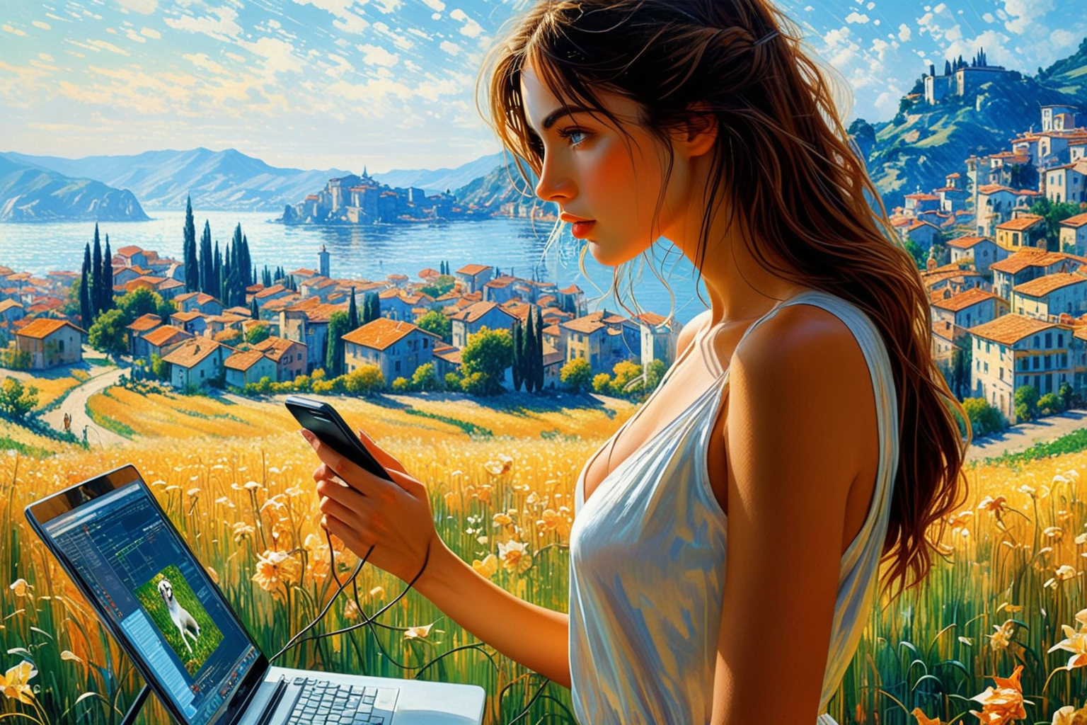 NSFW, young woman, beautiful face, standing, great body, gorgeous figure, long legs, pretty eyes, long hair, learns Dog programming language, beautiful background, magnificent scenery, Umberto Boccioni style, HD, sharp focus, stunningly beautiful, hyper-detailed, Advertising poster style, Professional, modern, product-focused, commercial, eye-catching, highly detailed