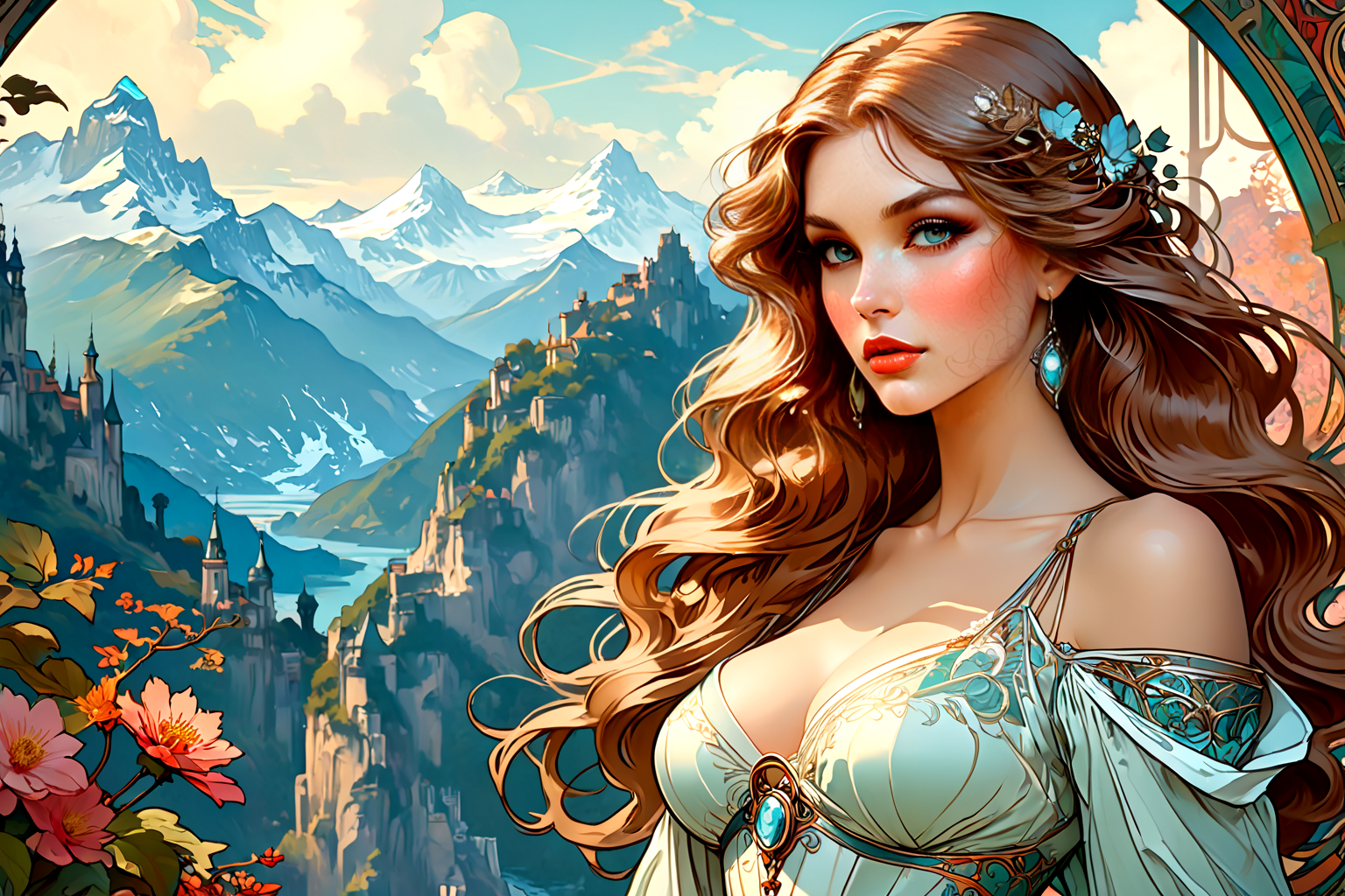 young woman, beautiful face, great body, gorgeous figure, long legs, pretty eyes, long hair, great bust, beautiful background, magnificent scenery, Alphonse Mucha style, HD, sharp focus, stunningly beautiful, hyper-detailed, Conceptual Art, concept art