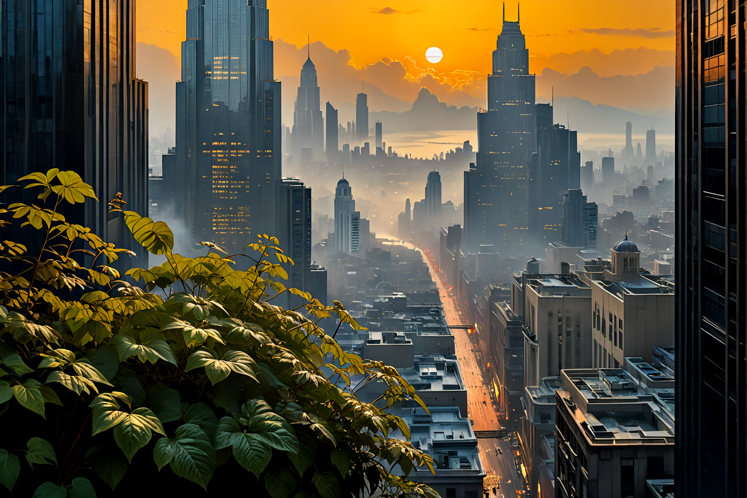 Create an Art Deco-inspired casein painting set in the United Arab Emirates during a mystical sunset, shrouded in fog. The composition depicts a traditional Arabian cityscape with elegant, towering skyscrapers reflecting golden hues from the setting sun. No people or animals are present, allowing the architectural marvels to take center stage. In the foreground, a delicate knotweed pattern climbs up the sides of buildings, adding a touch of natural beauty against the urban backdrop. The style should closely emulate Diego Velázquez’s technique, characterized by rich textures and subtle lighting.