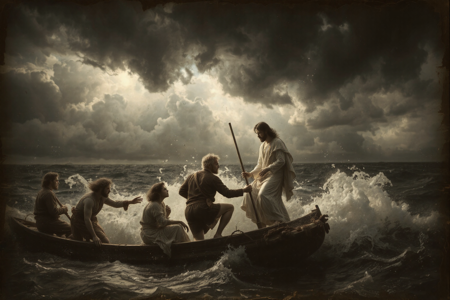 NSFW, The Storm on the Sea of Galilee by Rembrandt , Masterpiece, Dutch painter, Rembrandt, Storm on sea of Galilee, Jesus, disciples, sea, contrast, light, dark, tension, emotion, artwork, famous, influential, human emotions, powerful imagery. HD, sharp focus, stunningly beautiful, hyper-detailed, daguerreotype photo, 1920s photography, historical photo, aged photo, black & white photography, damaged photo