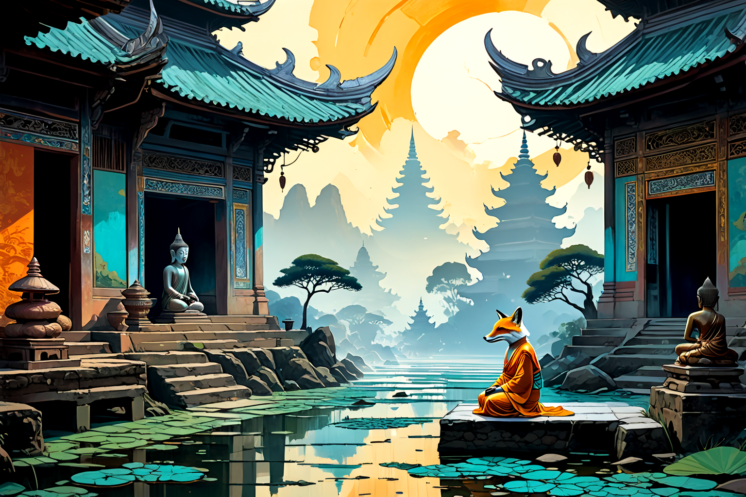 The picture takes place in Myanmar (Burma) at morning in the near future. The weather is a colossal, turquoise tsunami surging through the golden rice paddies. The scene is dominated by a dilapidated, ochre-colored pagoda partially submerged in the water, adorned with faded murals depicting mythical figures. Scattered around the base of the pagoda are remnants of a once-thriving market – overturned stalls overflowing with vibrant mulberry silk fabrics, broken pottery, and strange, bioluminescent mushrooms growing from the mud. A lone, elderly woman in traditional Burmese attire attempts to salvage a partially submerged Buddhist statue, her face etched with sorrow. In the distance, a small, silver-furred fox with large, intelligent eyes watches the event, seemingly unafraid. The style is Naïve art in Collage Painting technique by artist Giacomo Balla, with layered textures, bright, slightly distorted colors, and a whimsical, dreamlike quality. The overall mood is melancholic and surreal.