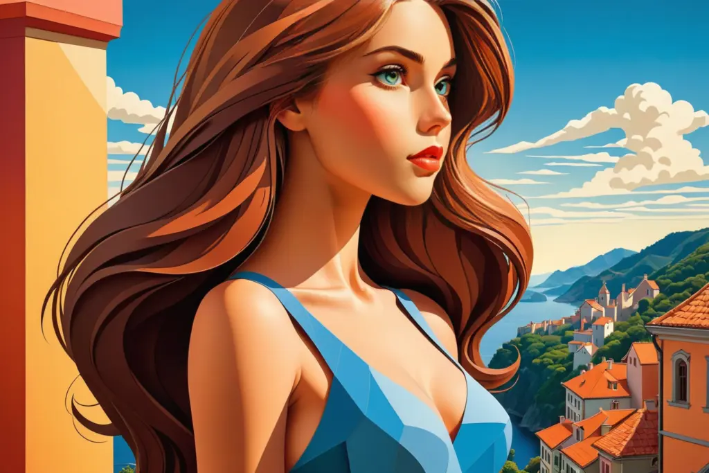 young woman, beautiful face, great body, gorgeous figure, long legs, pretty eyes, long hair, great bust, beautiful background, magnificent scenery, Oleg Tselkov style, HD, sharp focus, stunningly beautiful, hyper-detailed, Simple Vector Art, 2D flat, simple shapes, minimalistic, professional graphic, flat color, high contrast, Simple Vector Art