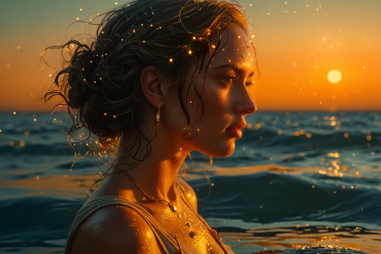 In this Namibian nighttime scene from ancient past, set amidst the mystical dew weather, Alexander Rodchenko’s Impasto Technique Marine genre painting unfolds. Within it lie softly glistening waters, reminiscent of a Douglas-fir forest in the distance. At its center, a young woman stands in reverence as marine creatures dance with stars above them, illuminated by the moonlight, forming an enchanting connection between land and sea. The picture is both mystical and captivating, evoking a sense of wonder for those that gaze upon it.