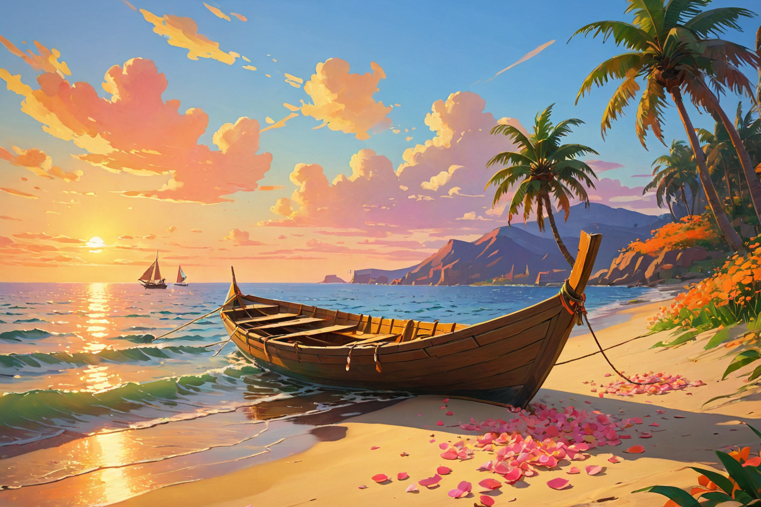 Amidst this idyllic landscape, clusters of Leucothoe flowers bloom vibrantly along the coastline, their delicate petals reflecting the last rays of sunlight. The entire scene is captured with an Impressionist flair, reminiscent of Victor Borisov-Musatov’s board painting technique, where colors blend softly and forms are suggested rather than defined, creating a dreamlike quality that transports viewers to this timeless moment in the Solomon Islands.