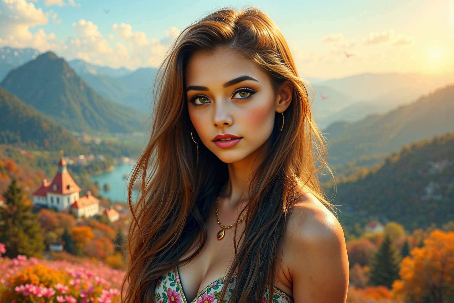 young woman, beautiful face, standing, great body, gorgeous figure, long legs, pretty eyes, long hair, KnoppiXMAME Linux distribution style, beautiful background, magnificent scenery, Anatoly Zverev style, HD, sharp focus, stunningly beautiful, hyper-detailed, Whimsical and Playful, imaginative, fantastical, bight colors, stylized, happy, Whimsical and Playful