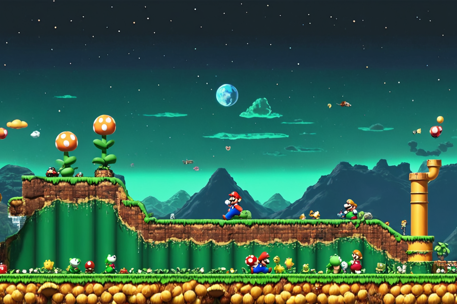 Game: Super Mario Bros. 3 (1988), Valery Koshlyakov style, , Super Mario Bros., rescue mission, Princess Peach, Yoshi, friends, Bowser’s minions, Dinosaur Land, magical powers, diverse levels, enhanced movement capabilities, formidable boss battles. HD, sharp focus, stunningly beautiful, hyper-detailed, glow effects, godrays, Hand drawn, render, 8k, octane render, cinema 4d, blender, dark, atmospheric 4k ultra detailed, cinematic, Sharp focus, big depth of field, Masterpiece, colors, 3d octane render, 4k, concept art, trending on artstation, hyperrealistic, Vivid colors, extremely detailed CG unity 8k wallpaper, trending on CGSociety, Intricate, High Detail, dramatic