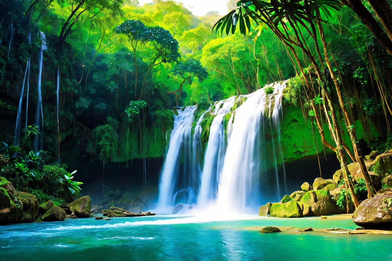 Kuang Si Falls Laos, Edward Burne-Jones style, , Laos, falls, Kuang Si, waterfalls, landscapes, nature, beauty, breathtaking, lush green, majestic, cliffs, peaceful, atmosphere, crystal-clear waters. HD, sharp focus, stunningly beautiful, hyper-detailed, Food photography style, Appetizing, professional, culinary, high-resolution, commercial, highly detailed