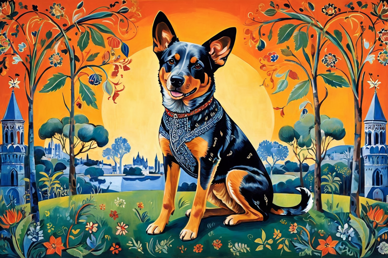 Australian Cattle Dog, Raoul Dufy style, HD, sharp focus, stunningly beautiful, hyper-detailed, Medievalism, inspired by The Middle Ages, medieval art, elaborate patterns and decoration, Medievalism