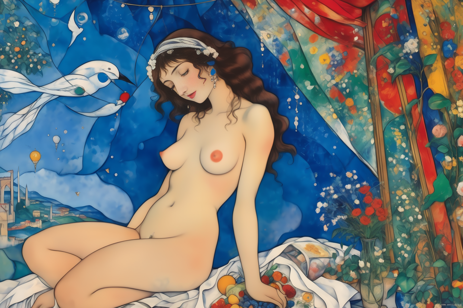 nude, NSFW, Bayt Saḩam, Syria, Marc Chagall style, , clear, bright, gentle breeze, warm, stay hydrated, enjoy, beautiful, Bayt Sa•him, Syria HD, sharp focus, stunningly beautiful, hyper-detailed, manga style, vibrant, high-energy, detailed, iconic, Japanese comic style