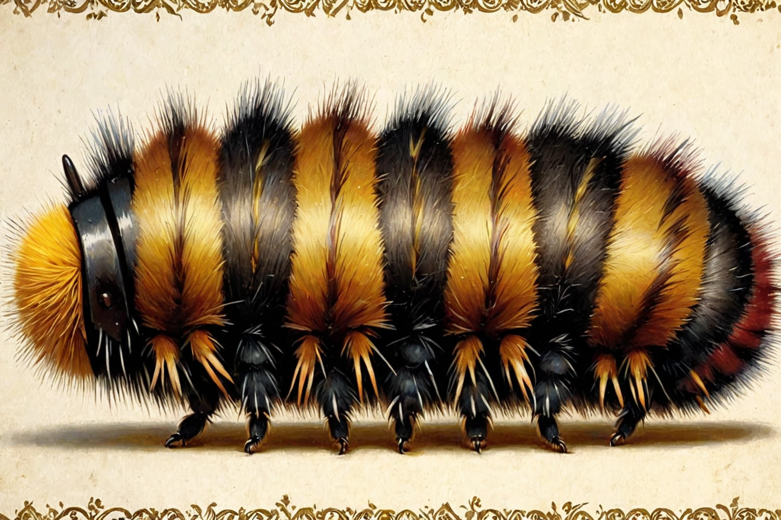 Woolly Bear Caterpillar, Vermeer style, HD, sharp focus, stunningly beautiful, hyper-detailed, Medievalism, inspired by The Middle Ages, medieval art, elaborate patterns and decoration, Medievalism
