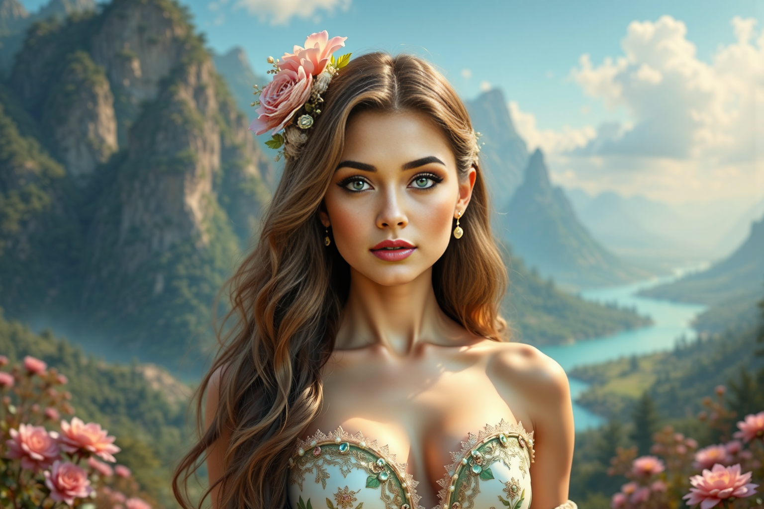 young woman, beautiful face, standing, great body, gorgeous figure, long legs, pretty eyes, long hair, GICTrade style, beautiful background, magnificent scenery, Fyodor Rokotov style, HD, sharp focus, stunningly beautiful, hyper-detailed, Neo-Rococo, curved forms, naturalistic ornamentation, elaborate, decorative, gaudy, Neo-Rococo