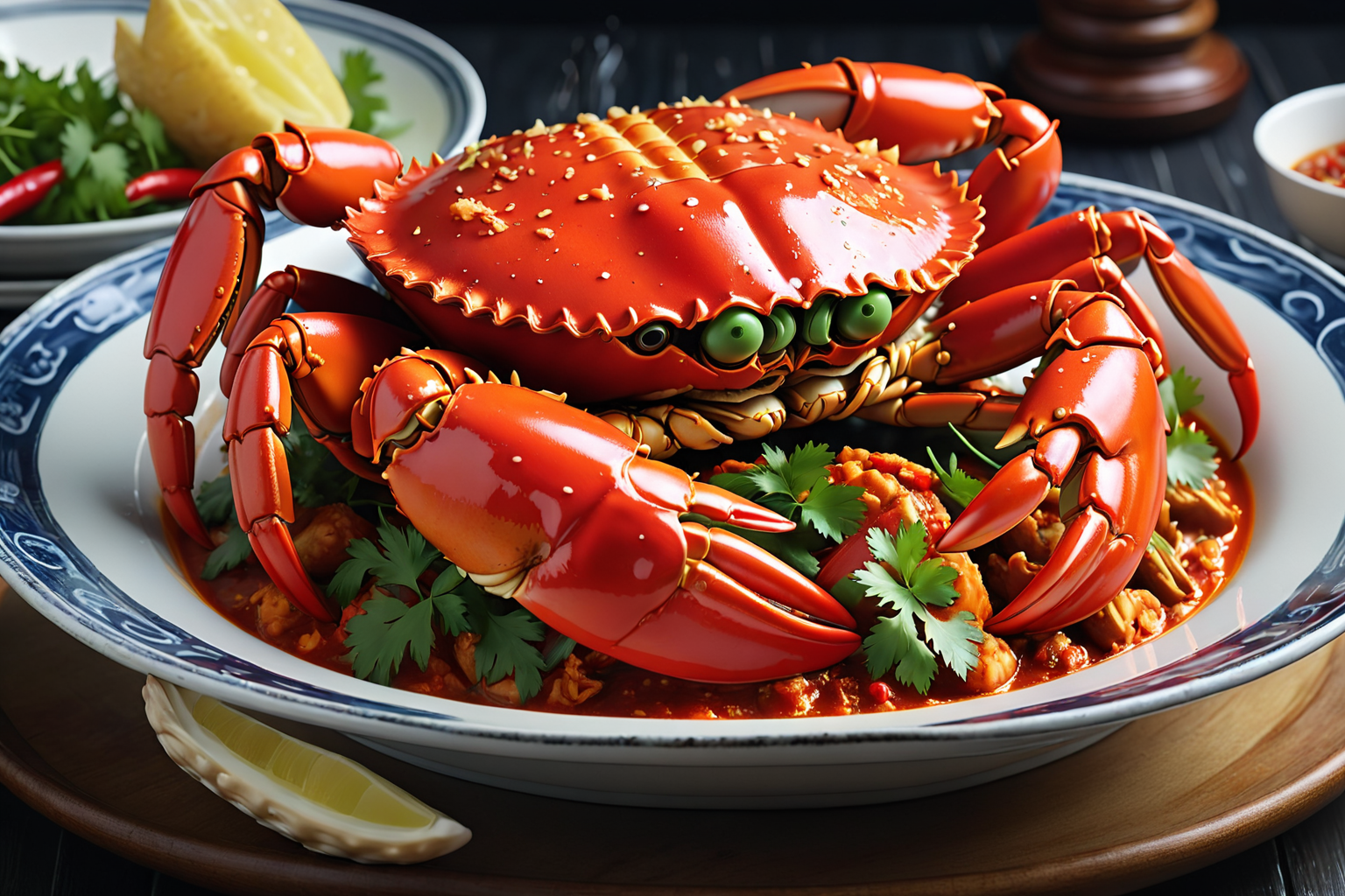 Chili crab dish , Hans Richter style, HD, sharp focus, stunningly beautiful, hyper-detailed, nautical-themed, sea, ocean, ships, maritime, beach, marine life, highly detailed
