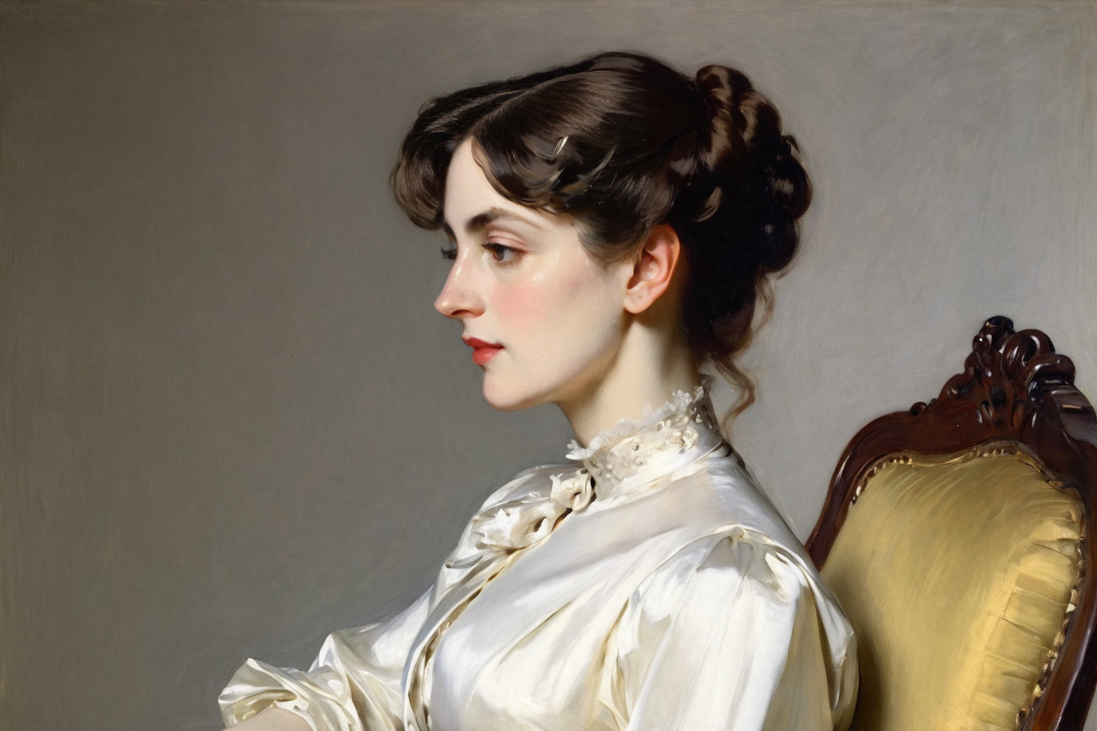 Isabella Stewart Gardner by John Singer Sargent , Isabella Stewart Gardner, John Singer Sargent, portrait, businesswoman, patron of the arts, loose brushwork, vivid color, Aesthetic Movement style, prominent Boston society women, intellect, passion for art collection, candid, informal sitting. HD, sharp focus, stunningly beautiful, hyper-detailed, detailed skin texture, (blush:0,2), (goosebumps:0,3), subsurface scattering