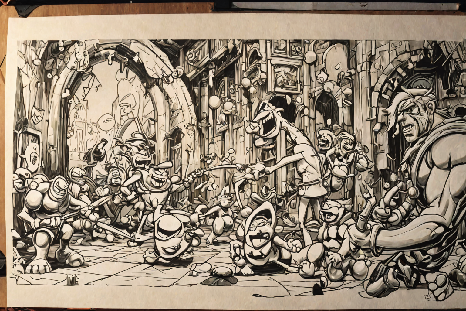 nude, NSFW, Game: Rayman Legends (2013), Max Beckmann style, , Rayman Legends (2013), Wii U exclusive, Gamepad, touch-based control, Murphy, specific stages, other releases HD, sharp focus, stunningly beautiful, hyper-detailed, Marker Drawing, bold marker lines, visibile paper texture, marker drawing